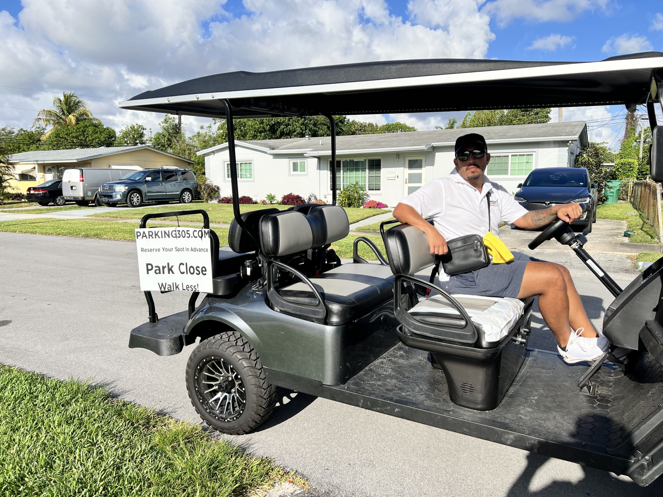 Golf carts typically operate in two areas. Near Lot 30 on NW 37th Avenue, which is also the rideshare drop-off zone, the walk to the stadium can be 25–40 minutes. Golf carts here will take fans part of the way to shorten the walk. On the Norwood side near NW 14th Court and 199th Street, carts circle the neighborhoods offering short rides, but they usually cannot cross the Turnpike bridge, so they cannot provide a full gate drop-off. Prices range from $10–$20 per person depending on the ride.