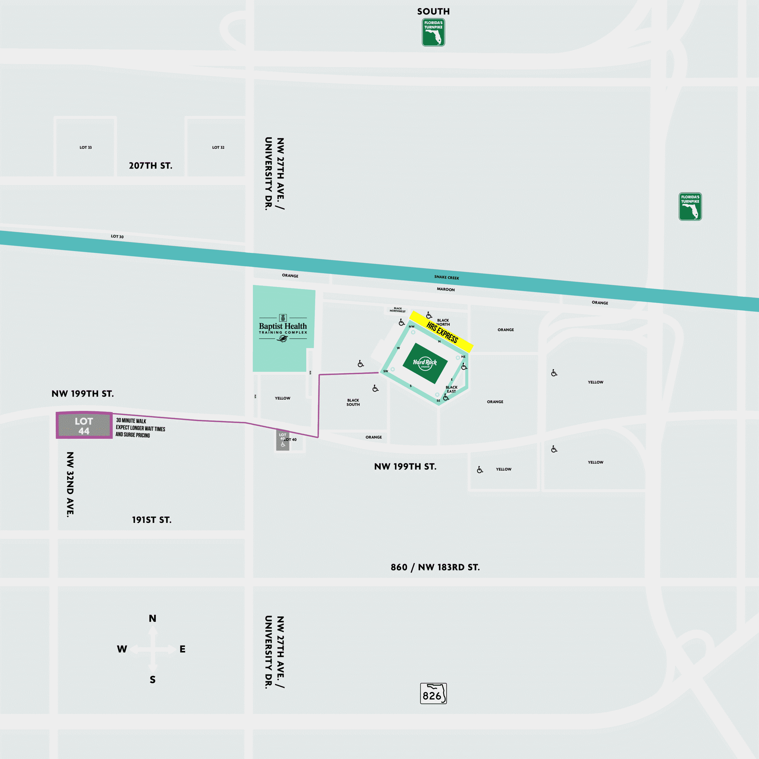 Choosing the right yellow lot can save you serious time after the game. Lots 13–14 are better if you are heading north, while 15–17 work best if you are going south or east. NW 199th Street and Turnpike Exit 2X are two of the biggest choke points, and your route home will feel completely different depending on where you park.